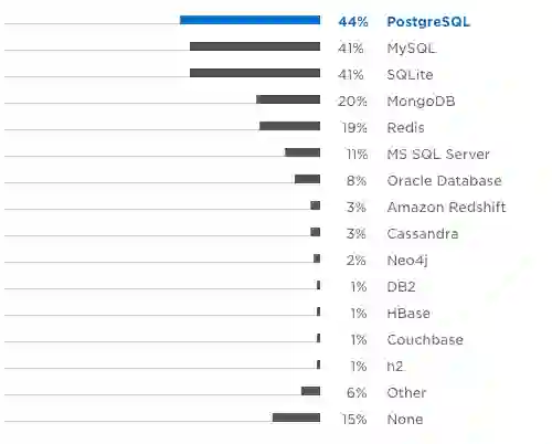 大多数人使用免费或开源数据库,如 PostgreSQL,MySQL 或 SQLite MongoDB 和 Redis 等非关系型数据库也非常受欢迎,因为大量的 Python 用户正在进行某种形式的机器学习或数据工程。