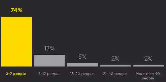约三分之一的开发者在规模很小的团队中工作,其中 74% 的团队规模为 2-7 人。团队规模的数据与去年相比没有变化。