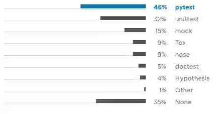 pytest 在测试框架排名中领先,其次是 unittest。其他测试框架远没那么受欢迎。出乎意料的是,35%的 Python 用户不使用任何测试框架,并且可能没有测试他们的代码。在“创建隔离的 Python 环境的工具”部分中,我们发现大约五分之一的 Python 用户不使用 Python 隔离这一最佳实践。