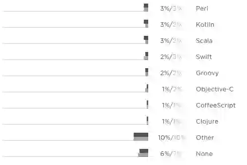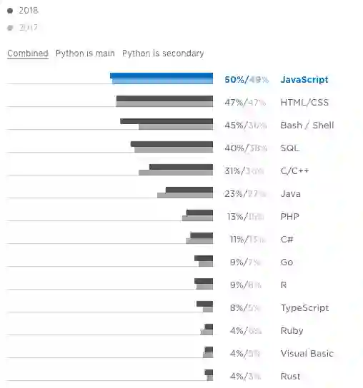 Python 用户中有一半还使用 JavaScript。 2018 年的统计数据与 2017 年的结果非常相似,唯一显著的区别是 Bash / Shell 从 2017 年的 36%增长到 2018 年的 45%。Go 和 SQL 都增长了 2 个百分点,而 C / C ++、Java 和 C#等许多其他语言的占比降低。