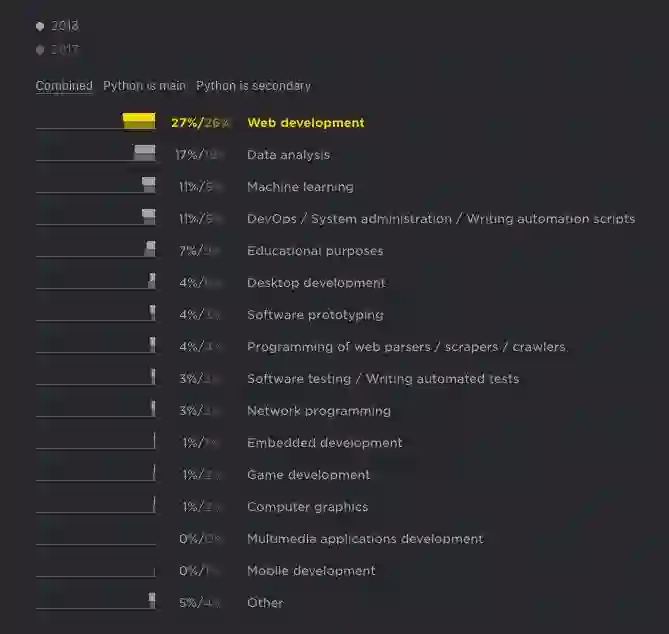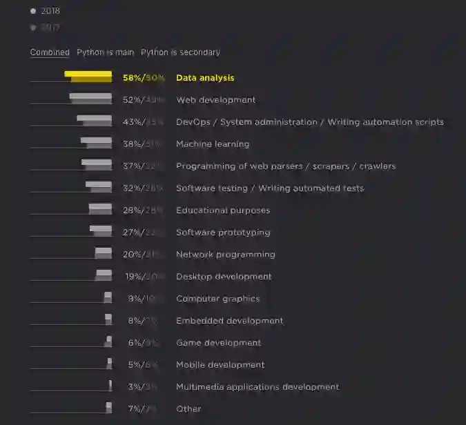 2018 年,使用 Python 做数据分析的用户最多,其次是 web 开发,再次为 DevOps/ 系统管理 / 编写自动化代码、机器学习等。