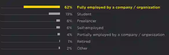 超过一半(62%)的 Python 用户全职工作,19%为学生,而只有 13%为自雇人士或自由职业者。与 2017 年相比,2018 年,学生人数明显减少,就业人数更多。