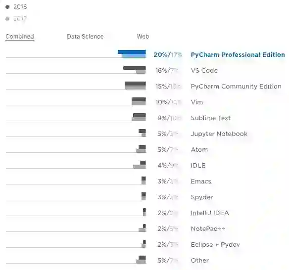 PyCharm 是最受欢迎的 Python 开发工具,PyCharm Professional 和 Community 版本的合计份额为 35%。有趣的是,VS Code 的占比从 2017 年的 7%上升到 2018 年的 16%,成为第二大受欢迎的 Python 开发编辑器。很可能由于 VS Code 的快速增长,许多其他编辑的用户份额减少了。