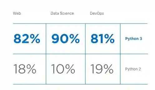 另一个有趣的发现是,只有 82% 主要用于 Web 开发的用户使用 Python 3,而涉及数据科学的 Python 3 采用率上升至 90%。
