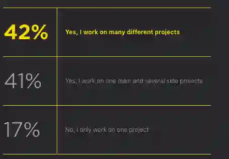 只有五分之一的 Python 用户只从事一个项目 ; 其余人的工作涉及许多不同的项目,或负责一个主要项目和若干次要项目。