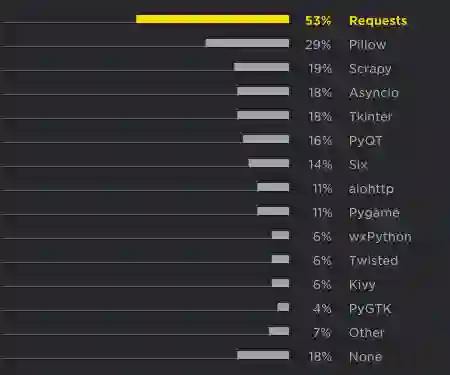 在普通框架和库中,不出所料,超过一半的 Python 用户使用了 Requests。Pillow 也非常受欢迎,1/5 用户使用 asyncio。
