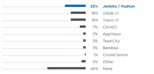将近一半 Python 用户不使用任何 CI 方案。Python 世界中最受欢迎的三个 CI 解决方案是 Jenkins,Gitlab CI 和 Travis。
