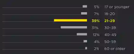 受访者普遍年龄在 20 岁左右(39%),近三分之一是 30 多岁(31%),许多年轻人似乎也融入了 Python 社区(5%)。