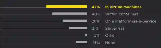 在虚拟机上占比 47%,在容器中占比 40%,在 PaaS 上占比 28%,在 Severless 中占比 21%。