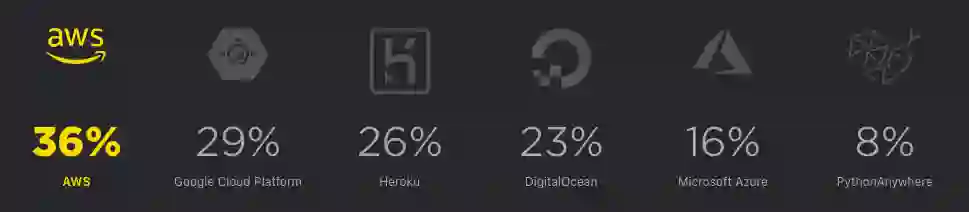 AWS 是 Python 开发人员最受欢迎的云平台,其次是 Google Cloud Platform,Heroku,DigitalOcean 和 Microsoft Azure。