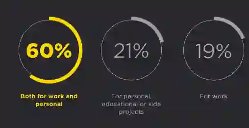 60% 的用户在家和工作中都会使用 Python,21% 的人将之用于个人、教育或辅助项目,19% 用于工作。
