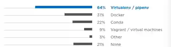 在开发或部署阶段隔离 Python 环境很久以来是一个最佳实践。毫无疑问,pipenv 和较低级别的 virtualenv 是创建和管理新的 Python 环境的两个最常用的工具,64% 的受访者表示会使用这两个工具进行 Python 环境隔离,31% 的用户会使用 Docker,其次是 Conda、Vagrant/ 虚拟机和其他。令让人惊讶的是,21%的 Python 用户根本不使用以上工具。