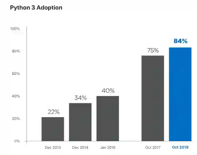 Python 3 的采用率从过年 2013 年的 22%,到 2018 年 10 月已攀升至 84%。
