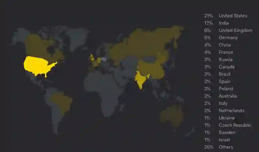 21% 美国,12% 印度,6% 英国,5% 德国,4% 中国,4% 法国,3% 俄罗斯,3% 加拿大,3% 巴西,2% 西班牙,2% 波兰,2% 澳大利亚,2% 意大利,2% 荷兰,1% 乌克兰,1% 捷克共和国,1% 瑞典,1% 以色列,25% 其他