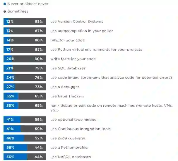 我们找到了在 Python 中相对受欢迎的开发工具和功能:版本控制,代码自动完成,代码重构,编写单元测试以及使用 Python 项目的虚拟环境都位列 Top10。