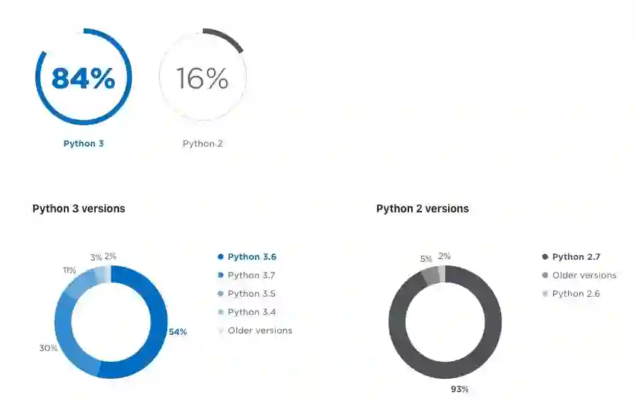 Python 3 的采用率正在快速增长,并且已经达到 84%,而 Python 2 仅被 16%的 Python 用户用作主要的注释器。从 2017 年的 75%到 2018 年的 84%,这对于 Python 3 来说是一个巨大的飞跃。