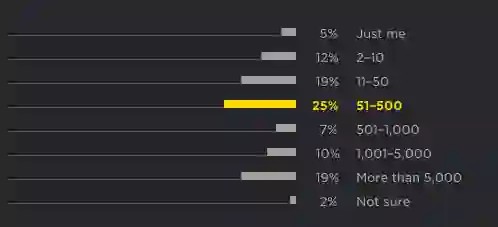 25% 的受访者在 51-500 人的企业中工作,这一部分占比最大,其次为 11-50 人和 5000 人以上企业,占比均为 19%。