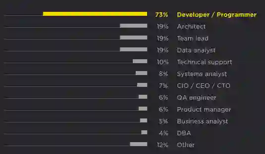 这是个多选题,因此总百分比大于 100%。将近 3/4 受访者为开发者,1/5 为数据分析家、架构师或团队领导。在占比为 12% 的“其他”部分,最多的职位头衔为数据科学家、DevOps、研究员和教师。