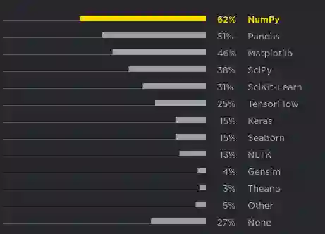 NumPy,Pandas,Matplotlib 和 SciPy 是最受欢迎的数据科学框架和库。机器学习专用库,如 SciKit-Learn,TensorFlow,Keras 等,也很受欢迎。