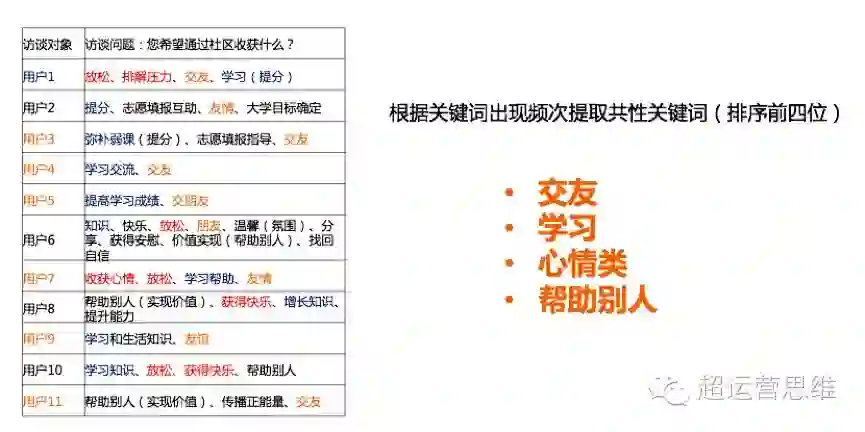 比如,我们针对某在线教育(K12领域)的社区用户的访谈对象的结果进行关键词提炼进行举例: