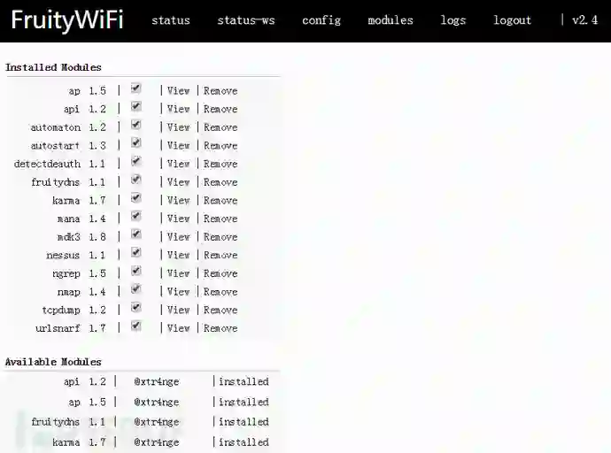 modules:这里列出了许多可用的插件,可供下载使用。树莓派3B自带的无线网卡是不支持monitor模式的,如果想使用mdk3这种需将网卡设置为monitor模式的模块,需外置个支持monitor模式的USB无线网卡。