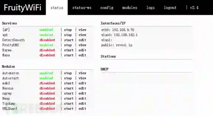 FruityWIfi是一款有名的无线安全审计的开源工具,其灵感来自于wifipineapple,目前该工具已经更新到2.4。它能够让用户通过web界面来控制和管理模块,十分方便。FriutyWifi最初的设想是能够在树莓派上使用,但是也可以安装在Debian系列的操作系统上,例如Debian,kali Linux等,甚至可以安装在NetHunter上,在某些移动设备上使用。