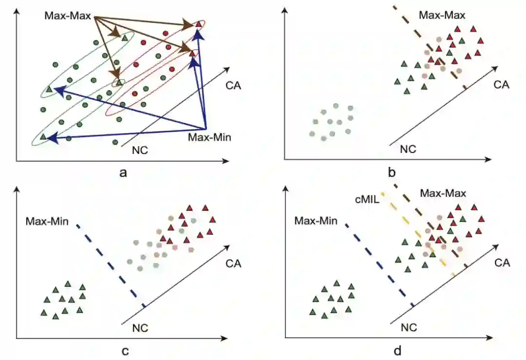 图2: Max-Max与Max-Min判据示意图,红色和绿色圆圈分别代表CA和NC图像块,这里我们使用三角形来表示选择出的图像块,每个椭圆代表一个图像包