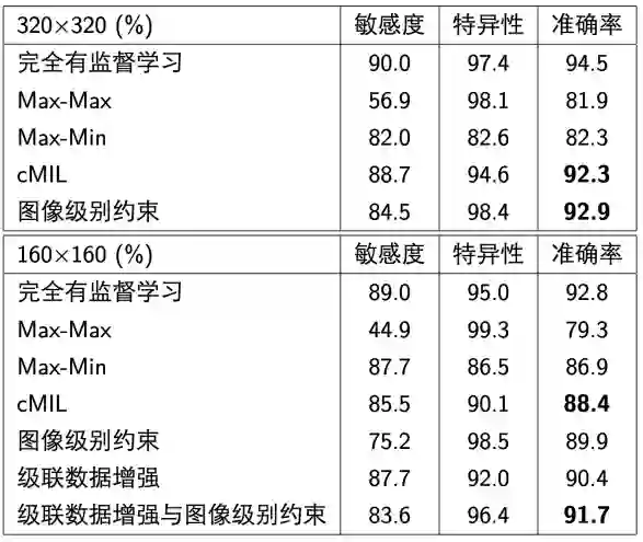 如表1和图4所示,Max-Max倾向于给出低敏感度高特异性的结果,Max-Min则恰好相反。结合二者所获得的数据,可以得到更加均衡的模型。可以看到,CAMEL获得的320×320和160×160图像块标注数据准确率仅比完全有监督模型低1.6%和1.1%。
