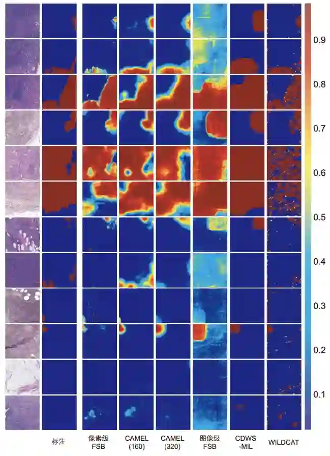 使⽤160×160图像块所获得的模型准确率高于320×320(见图5),说明了监督信息增强方法的有效性。我们在图6给出了不同模型在切片级数据上的预测结果。