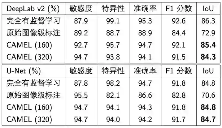 我们测试了DeepLab v2(ResNet-34)和U-Net在图像分割上的表现,表2给出了不同模型的敏感度、特异性、准确率和交并比(intersection over union, IoU)。可以看到,CAMEL的效果远好于原始图像级标注,并接近完全有监督学习。