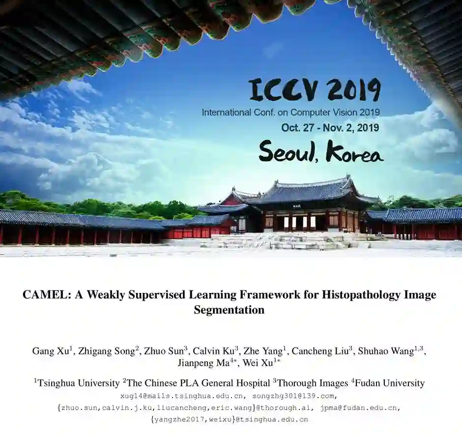 在本研究中,我们提出了仅使用图像级标签进行组织病理学图像分割的弱监督学习框架CAMEL,并获得了与有监督学习相当的模型准确率。CAMEL是一个通用的算法框架,同样适用于其他领域的相关应用。