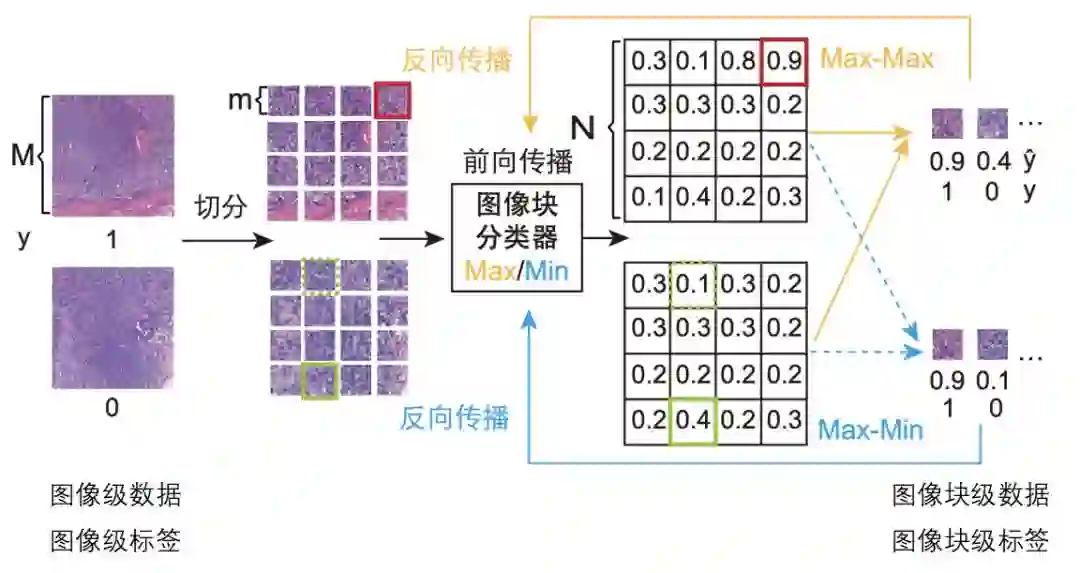 相比之下,弱监督学习仅需要图像级别的粗粒度标签,能够大幅降低标注的工作量。由于单个数字病理切片尺寸过大,仅通过切片级诊断很难获得高准确率的结果(建立弱监督学习模型通常需要超过1万张数字切片 [1]),研究人员通常将数字病理切片划分为若干的图像(image),对每一个图像打上标签(例如在二分类的场景下,如果图像包含有癌区,则标注为1,反之标注为0),进而获得弱监督学习模型。