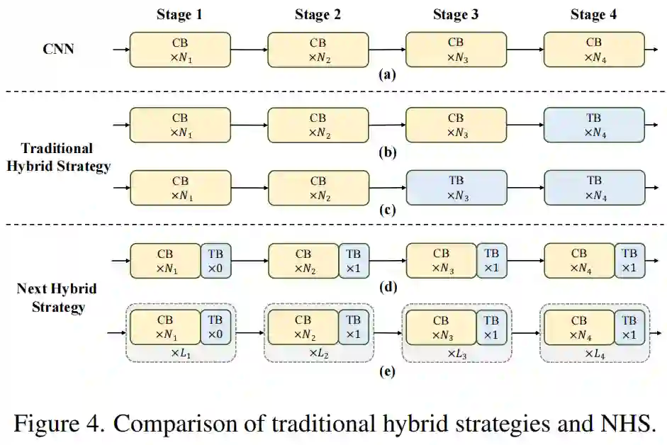 为了克服现有混合策略的失败,作者提出了一种新的混合策略 (NHS),它创造性地将卷积块 (NCB) 和Transformer Block (NTB) 与 (N+1)* L 混合范式堆叠在一起。NHS在控制 Transformer Block的比例的情况下,显著提升下游任务中的模型性能,以实现高效部署。