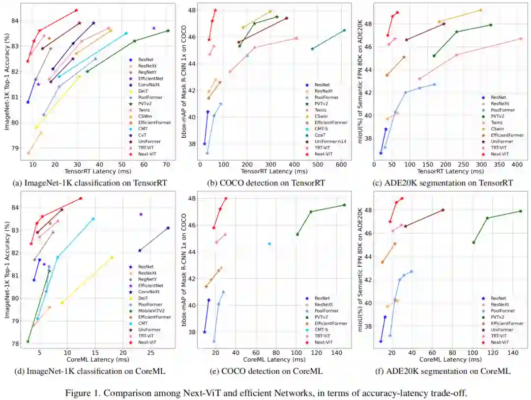 基于上述方法提出了用于现实工业部署场景的next generation vision Transformer(简称为Next-ViT)。在本文中,为了提供一个公平的比较,作者提供了一个观点,将特定硬件上的延迟视为直接的效率反馈。TensorRT 和 CoreML 分别代表了服务器端和移动设备的通用和易于部署的解决方案,有助于提供令人信服的面向硬件的性能指导。通过这种直接和准确的指导,重新绘制了图1中几个现有竞争模型的准确性和延迟权衡图。如图1(a)(d)所示,Next-ViT在ImageNet-1K分类任务上实现了最佳的延迟/准确性权衡。更重要的是,Next-ViT在下游任务上显示出了更显著的延迟/准确性权衡优势。