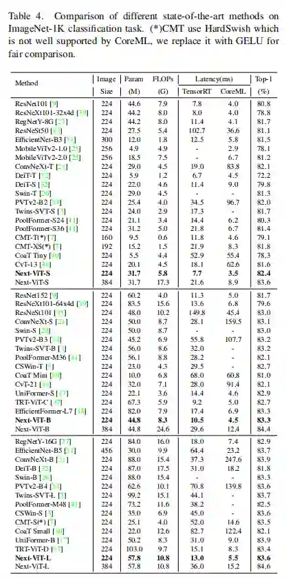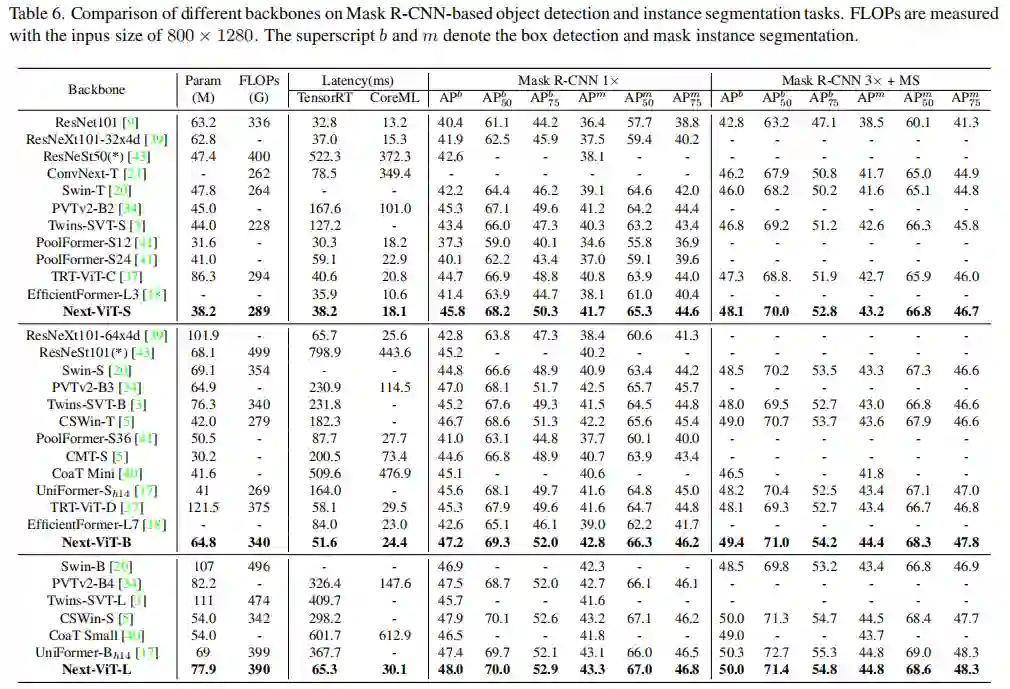 如图1(e)(f)所示,在CoreML上与EfficientFormer相比,Next-ViT超过了4.6mAP(从42.6到47.2),在ADE20K分割上超过3.6%mIoU(从45.2%到48.7%)。