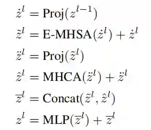 基于这些观察结果,作者开发了Next Transformer Block(NTB)来捕获轻量级机制中的多频信号。此外,NTB 作为一种有效的多频信号混频器,进一步提高了整体建模能力。如图2所示,NTB首先采用高效的多头自注意力(E-MHSA)捕获低频信号,可以描述为: