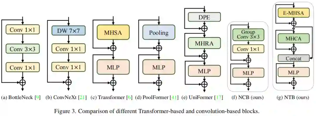 为了展示所提出的 NCB 的优越性,首先重新审视卷积和 Transformer blocks 的一些经典结构设计,如图 3 所示。ResNet 提出的 BottleNeck 块因其固有的归纳偏差和部署而在视觉神经网络中长期占据主导地位。大多数硬件平台的友好特性。
