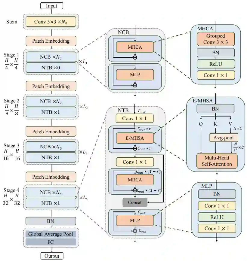 具体而言,MHCA 的实现是通过组卷积(多头卷积)和逐点卷积进行的,如图3(f)所示。在所有 MHCA 中将 head dim 统一设置为 32,以便在 TensorRT 上使用各种优化进行快速推理。此外,在 NCB 中采用了高效的 BatchNorm (BN) 和 ReLU 激活函数,而不是传统 Transformer Block 中的 LayerNorm (LN) 和 GELU,进一步加快了推理速度。消融研究中的实验结果表明,与现有块相比,NCB 具有优越性,例如 BottleNeck 块、ConvNext 块、LSA 块等。
