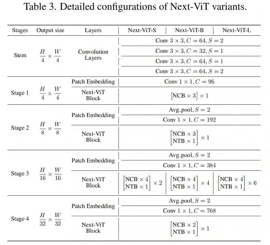 为了与其他 SOTA 网络进行公平比较,我们提出了三个典型的变体,即 Next-ViT-S/B/L。架构规范如表 3 所示,其中 C 表示阶段的输出通道,S 表示卷积或 Avg 池中的步幅。此外,NTB中E-MHSA和MHCA的信道比例r设置为0.75,E-MHSA中不同阶段的空间缩减率s为[8,4,2,1]。每个 MLP 层的扩展比设置为 2,E-MHSA 和 MHCA 中的 head dim 设置为 32。对于归一化和激活函数,NCB 和 NTB 块都使用 BatchNorm 和 ReLU。