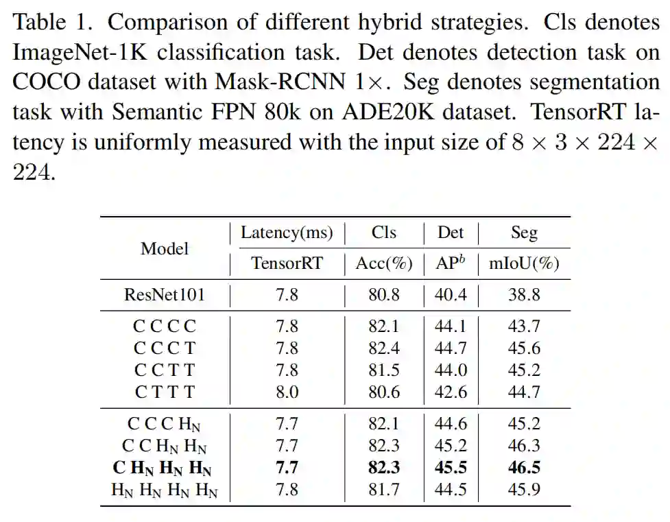 表示在相应阶段以 (NCB×N+NTB×1) 模式堆叠 NCB 和 NTB。表 1 中的所有型号都配备了4个阶段。例如,CCCC 表示在所有4个阶段中始终使用卷积块。为了公平比较,在相似的 TensorRT 延迟下构建所有模型。第 4 节介绍了更多实现细节。如表 1 所示,与下游任务中的现有方法相比,所提出的混合策略显着提高了模型性能。