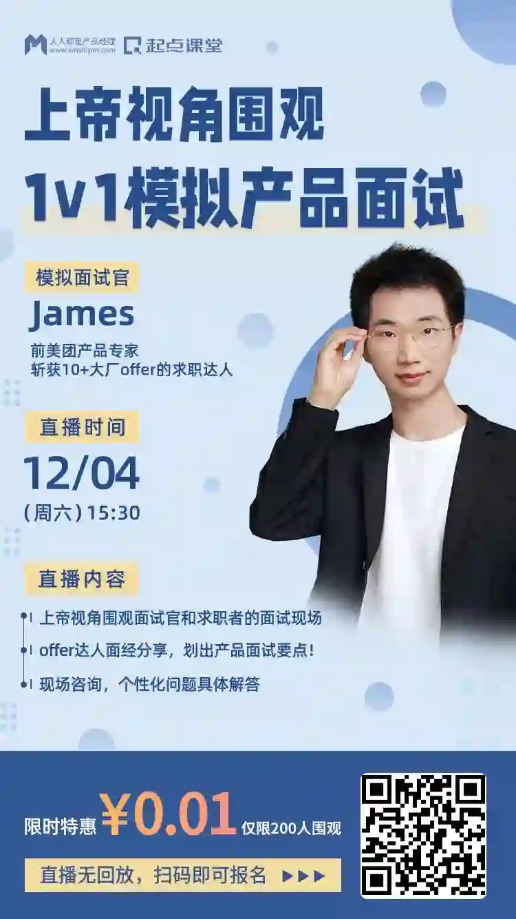为了帮助想要入行的同学更顺利地应对面试,避免出现令人心痛错失offer的情况,提升面试的通过率,人人都是产品经理社区&起点课堂特地邀请了前美团产品专家@James带大家体验一把模拟面试,现场连麦求职学员模拟真实面试,拆解求职面试答题要点。