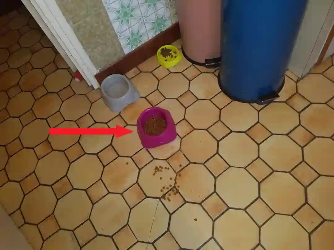但是如果仔细观察(在红色箭头的尖端),不难注意到,Peluche一边乱跑,一边把自己装食物的碗移动了位置。