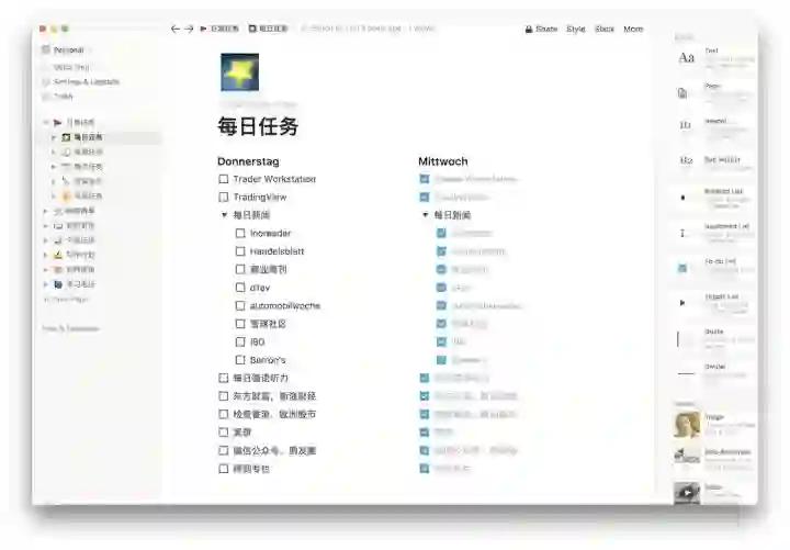 周期性重复任务我会使用独立的清单,放在 Notion 中,而不是放在 GTD 里面。GTD 里面的空间比较宝贵,能不用就不用。Notion 相比其他笔记的主要优点是所有内容都可以拖动,对于清单类文本非常重要。最近少数派刚刚有几篇介绍 Notion 的文章新鲜出炉,大家可以搜索一下。