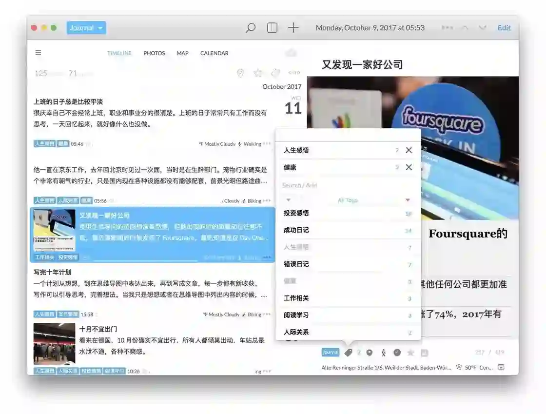 九宫格日记把日记的内容划分成几个区,分别对应生活中比较重要的东西,比如健康、投资感悟、人际关系等等,最初发明人是在 Excel 中写。我在 Day One 上做了个变形,用标签代替九宫格的格子,标签的内容按照「五年计划」的行动规划划分,如果当天有相关内容就打上对应的标签。这样一来,既能提醒自己该写些什么,又能快速找到对应分类的日记。