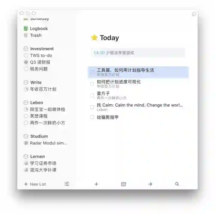 最最重要的,Things 3,没有之一。每天要在公司工作、上学、投资、写作和家务问题上来回转换,现在很难想象当初没有 Things 的时候是怎么活下来的,我的绰号可是「小龙虾(聋瞎)」。