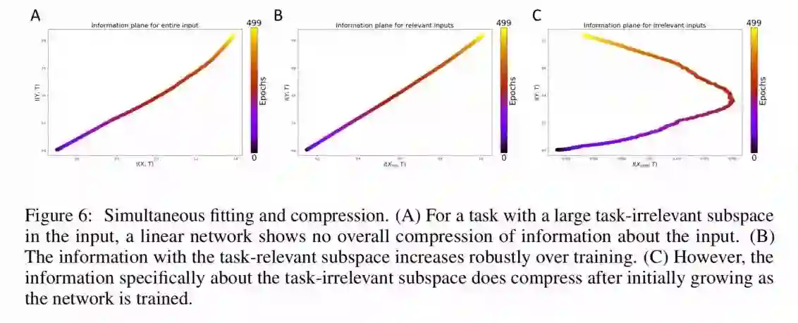 最后的实验将输入 X 分割成任务相关的输入和任务不相关的输入。前者贡献信号,后者贡献噪声。因此好的泛化似乎需要忽略噪声。论文作者发现当任务相关的信息发生拟合时,任务不相关的信息发生压缩,尽管整体看来没有观察到输入出现压缩阶段。
