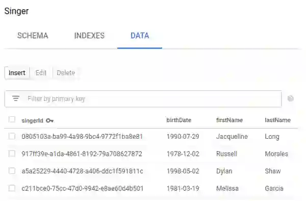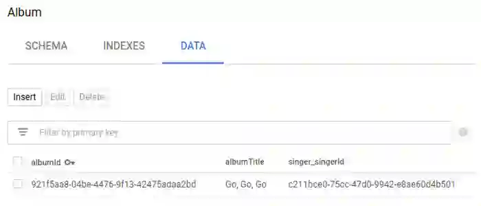 此时,如果您转到 Cloud Spanner 控制台并查看数据库中“歌手”和“专辑”表格的数据,则会看到以下内容: