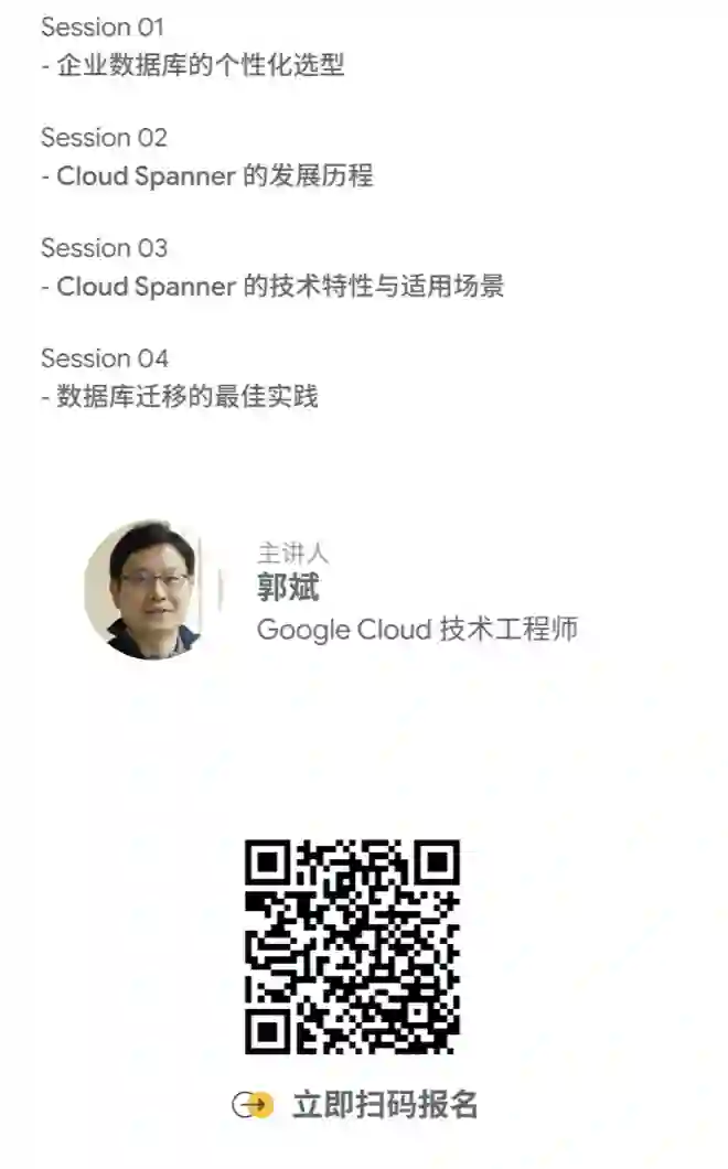 5 月 21 日的 Google Cloud 线上课堂,技术工程师郭斌讲带领大家了解企业如何进行数据库的选型,并针对介绍 Cloud Spanner 的技术特性,了解如何在具体场景中释放 Cloud Spanner 的工程能力。