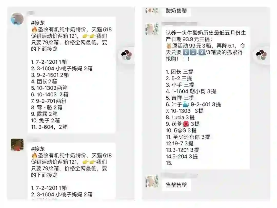 比如我所在的小区,就经常看到团长在群内做临期商品的团购,比如牛奶、酸奶、方便面。