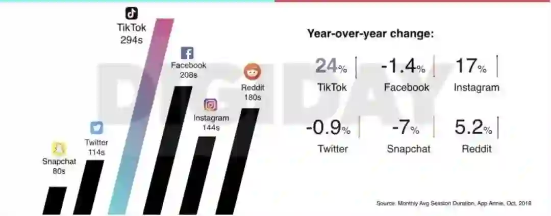 因为15秒短视频的数据“很精简”,因此平台相比其他公司的App应用可以更快地收集数据,从而可以改进自己的算法。用户要花10分钟在YouTube观看视频(然后产生数据),而同样时间TikTok系统可以获取40个15秒视频的观看数据。分析下面图中的数据内容,你就会发现与其他社交网络相比,TikTok与各家之间的巨大差异。